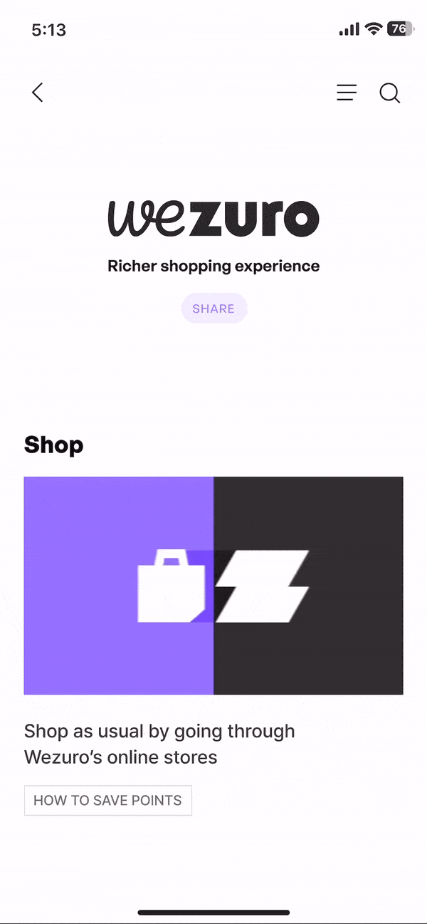 Wezuro is a newly designed cash back shopping product in 2023. As a product designer, I was involved from inception to completion. I proposed the initial direction naming to crafting the entire product, encompassing app design branding, overall service design, motion, app introduction page, interaction, and aspects of QA.